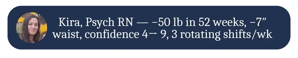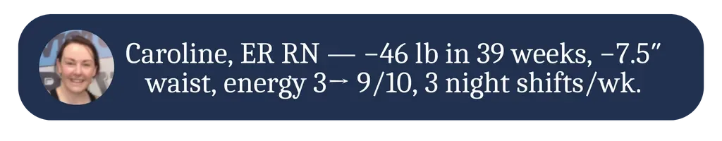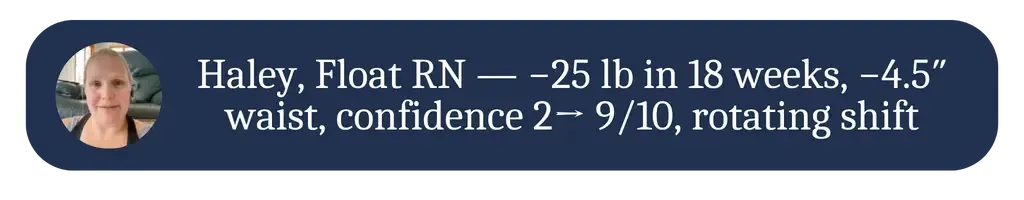 Most nurses lose 2–6 lb in 14 days, plus feel a 2‑point bump in energy and a reduction in stress 2-points. The real win is proving to yourself that you can be consistent as a nurse, then compounding that inside The Fit Nurse Collective.